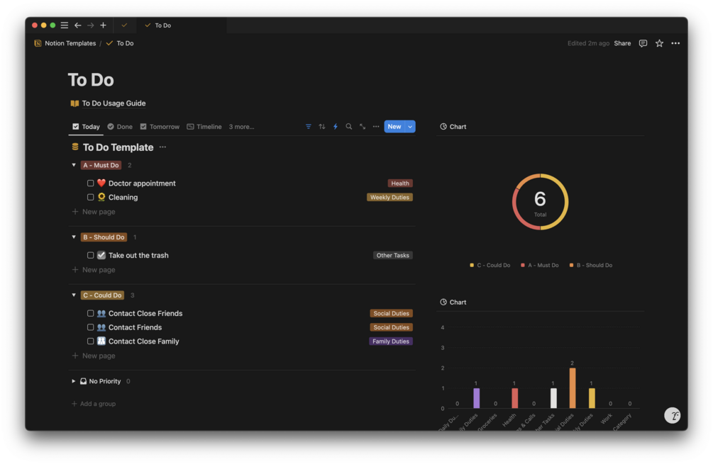 Organize tasks like a pro with the ABC Method Notion template. Prioritize effectively using categories A (must-do), B (should-do), and C (nice-to-do). Simplify your workflow and achieve your goals with structured clarity.